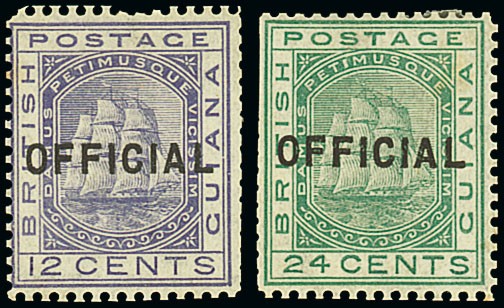 — prepared for use but not issued, 12c. pale violet and 24c. green, unused without gum; both with perforations virtually cut off on one side, otherwise fine. Rare. S.G. O11-O12, £3500. Photo