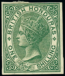 — 1/- green imperforate plate proof on watermarked paper, no gum, cut close at top, fine. Photo