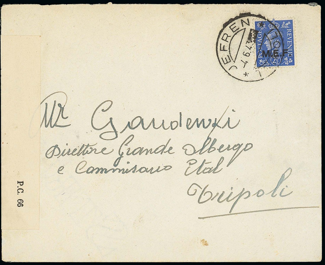 1943 (4 June) envelope from Jefren to Tripoli, bearing 1943 2½d. tied by double-ring datestamp (GBOD T26 and only recorded by them on a single stamp) and with "kk/381712 censor label at left. Photo
