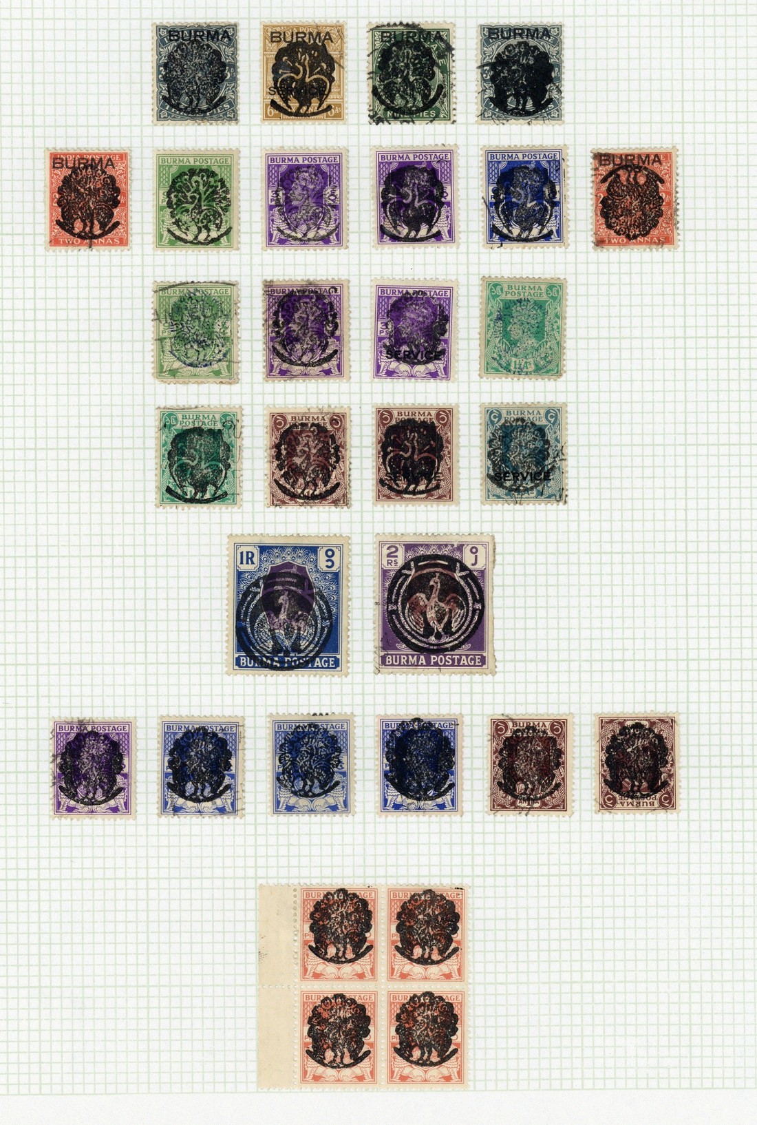 A largely unused/mint collection on leaves, including a range of the Peacock overprints to 2r. and Officals; Japanese Army Administration range with surcharges to 5r.; Burmese Government with Farmers and two sets of the Shan States issue; some blocks throughout. Condition mixed with a range of forgeries. Viewing essential