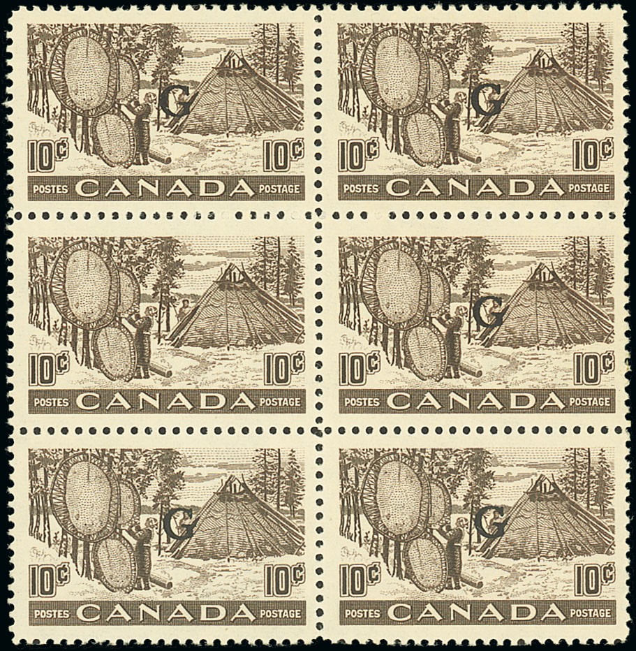 1950-51 10c. brown-purple, block of six (2x3), the third stamp variety overprint omitted, unmounted mint, fine. S.G. O191a, £950+. Photo