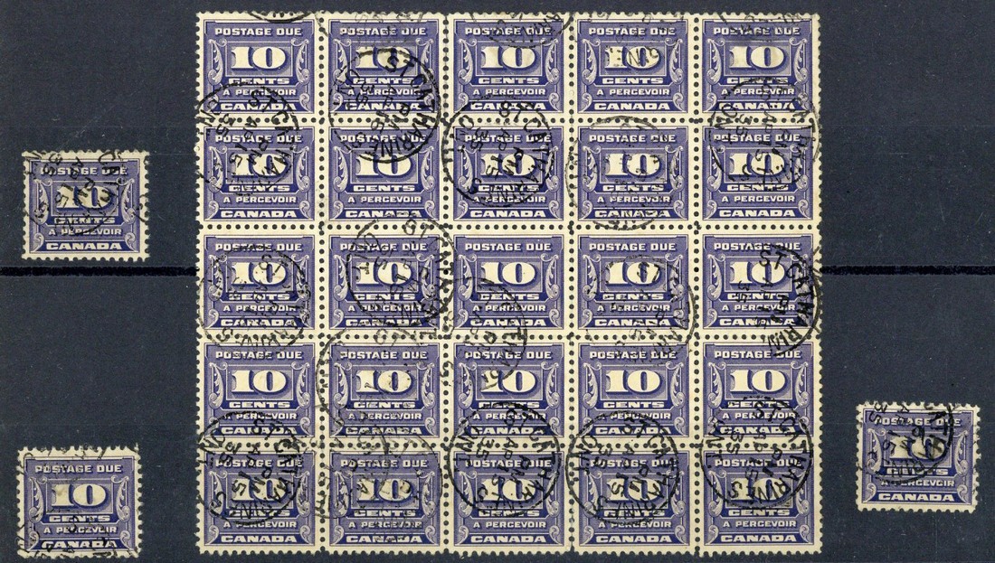 1933-34 10c. violet block of twenty-five (5x5) with 1935 St. Catherines, Ont c.d.s.; some split perfs. though an impressive and scarce block. Also three similarly cancelled singles. S.G. D17, £1,260 as singles