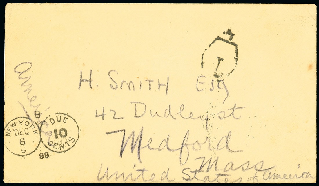 1899 (16 Nov.) Canadian Contingent unstamped "maple leaf" crested envelope from R.C. Bach of "E" Company to Medford, Mass., U.S.A., part of the unscheduled transfer of mail at sea to S.S. Rangatira showing framed tax handstamp and New York "due/10/cents" duplex (6.12) and, on reverse, London (29.11) and arrival (7.12) c.d.s. Photo