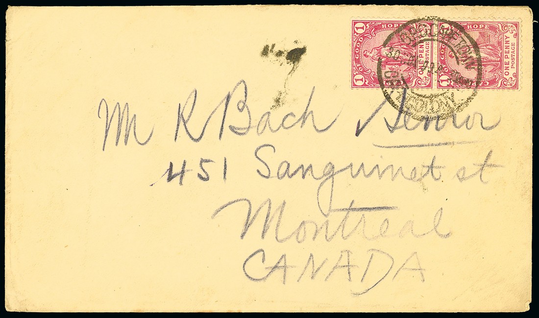 1899 (30 Nov.) Canadian Contingent "Maple leaf" crested envelope from R.C. Bach of "E" Company at Cape Town to Montreal, postage at the civilian rate with 1d. pair sharing c.d.s. and showing, on reverse, arrival c.d.s. (29.12); a scarce item of mail posted on the first day of arrival. Photo