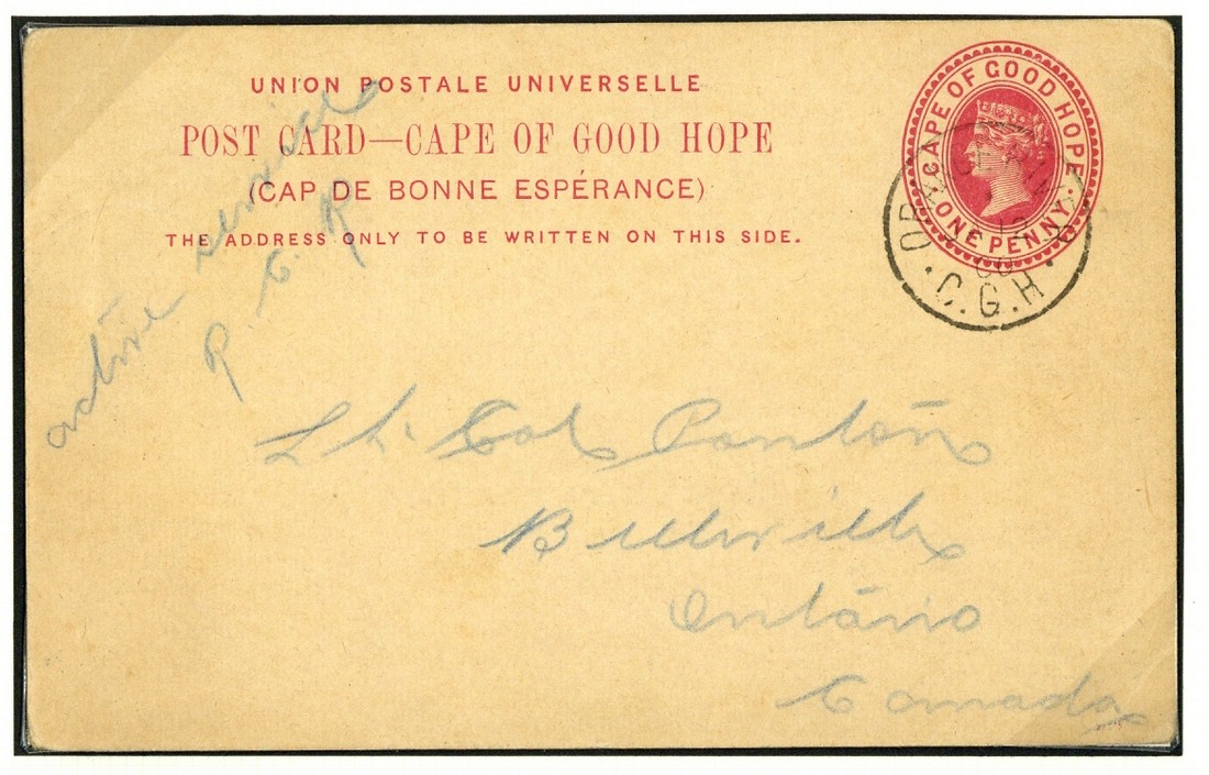 1900 (12 Jan.) C\ape 1d. card (three printed views on reverse) from Belmont Camp to Belleville, marked "Active service R.C.R." and cancelled by light Orange River c.d.s.; message reads "all well in camp"