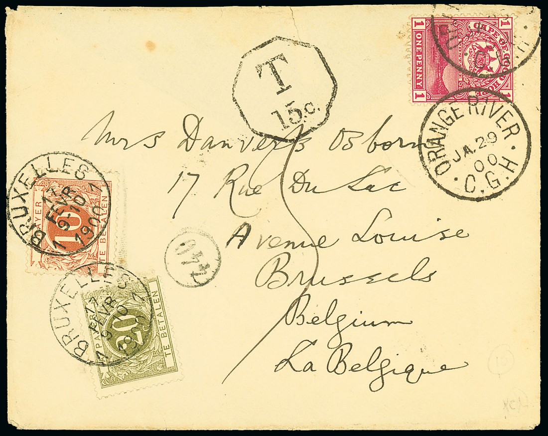 1900 (29 Jan.) envelope (flap missing) from Pte. D. Osborn at Belmont Camp to Belgium, bearing Cape 1d. with Orange River c.d.s. and underfranked, showing octagonal-framed "t/15c." and bearing 10c. and 20c. Postage Dues cancelled at Brussels (17.2); most attractive. Photo