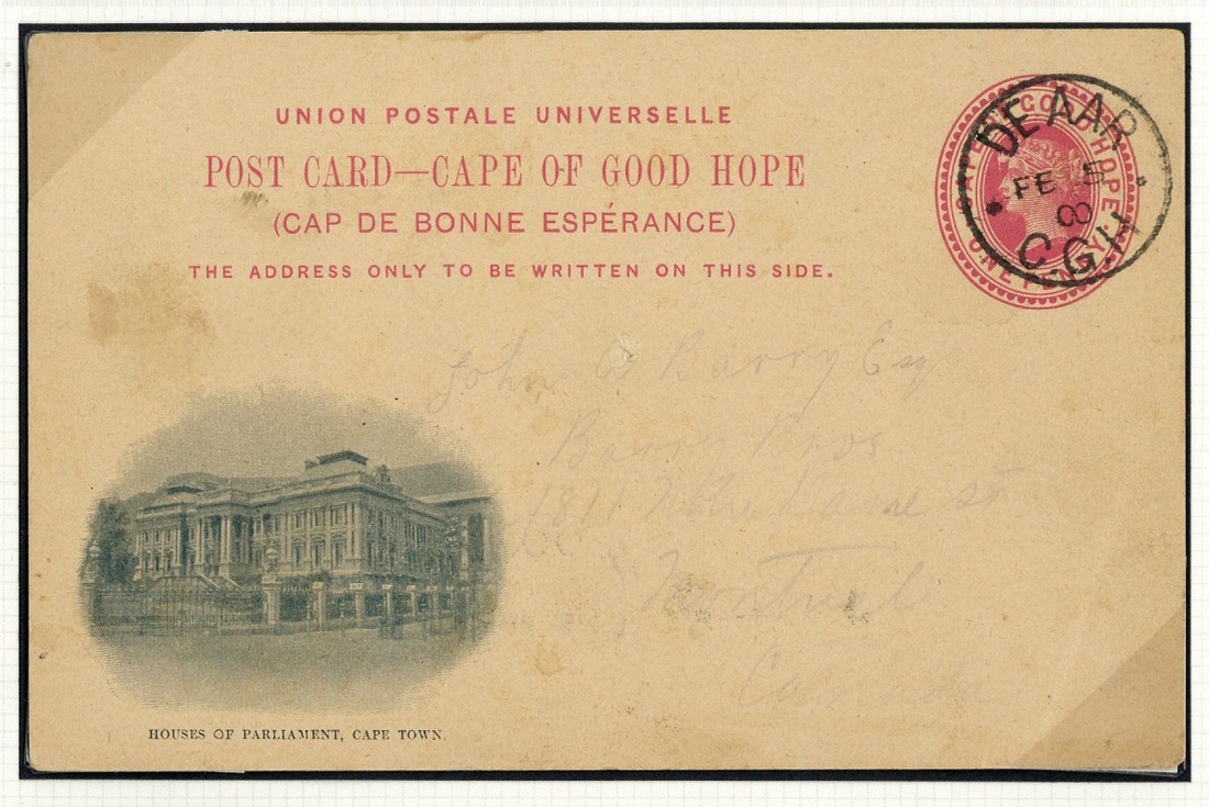 1900 (5 Feb.) Cape 1d. red card (view of Houses of Parliament on face) from C.H. Barry of "E" Company at Graspan to Montreal, cancelled by superb De Aar c.d.s.; the contents including reference to sending "three boxes yesterday by registration". Private Barry was killed in action on 18 February 1900 at the Battle of Paardeberg