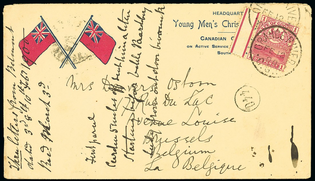 1900 (12 Feb.) Y.M.C.A. "crossed flags" envelope (Type E) ex the Osborn correspondence from Belmont Camp to Belgium, bearing 1d. with two Orange River c.d.s. and showing local delivery number below; the reverse (no flap) with arrival c.d.s. (3.3). Photo