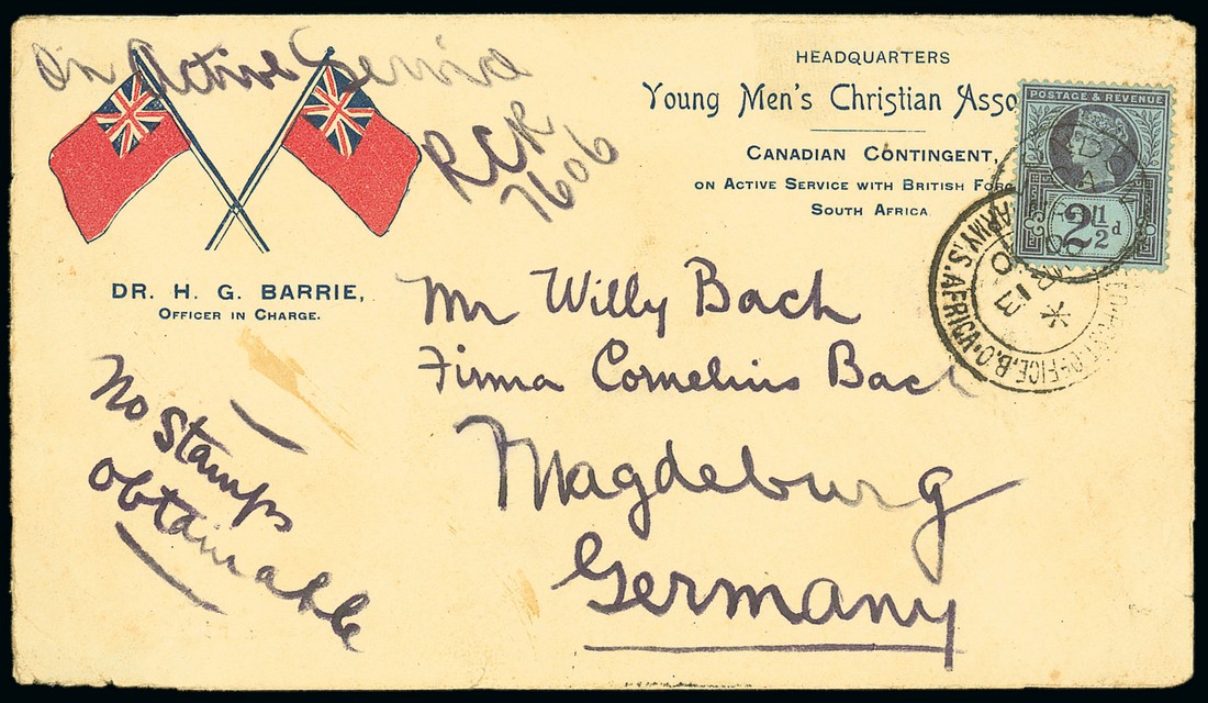 1900 (13 Mar.) Y.M.C.A. "crossed flags" envelope (Type D) from R.C. Bach of "E" Company at Poplar Grove Drift to Germany, marked "On Active Service RCR 7606" and "No stamps obtainable", cancelled by F.P.O. c.d.s. partially covered by G.B. 2½d. cancelled by London c.d.s. (31.3) to pay onwards transmission to Germany. Photo