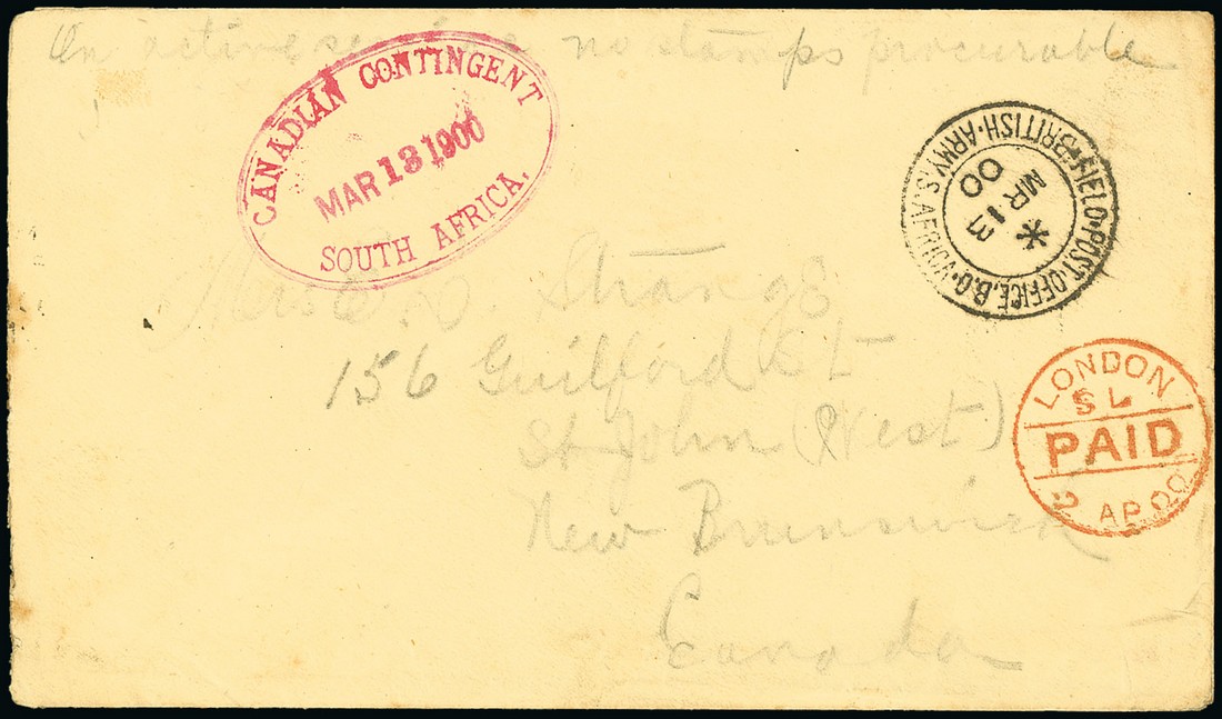 1900 (13 Mar.) unstamped Canadian Contingent "maple leaf" crested envelope from E.H. Strange of "G" Company at Poplar Grove Drift to New Brunswick, marked "On active service. No stamps procurable", showing F.P.O. c.d.s., a superb strike of the oval-framed "canadian contingent/south africa" datestamp in red and London Paid c.d.s. (2.4), St. John arrival c.d.s. (12.4) on reverse. A fine cover used on the first day of use of the oval cachet with "En Route" wording. Photo