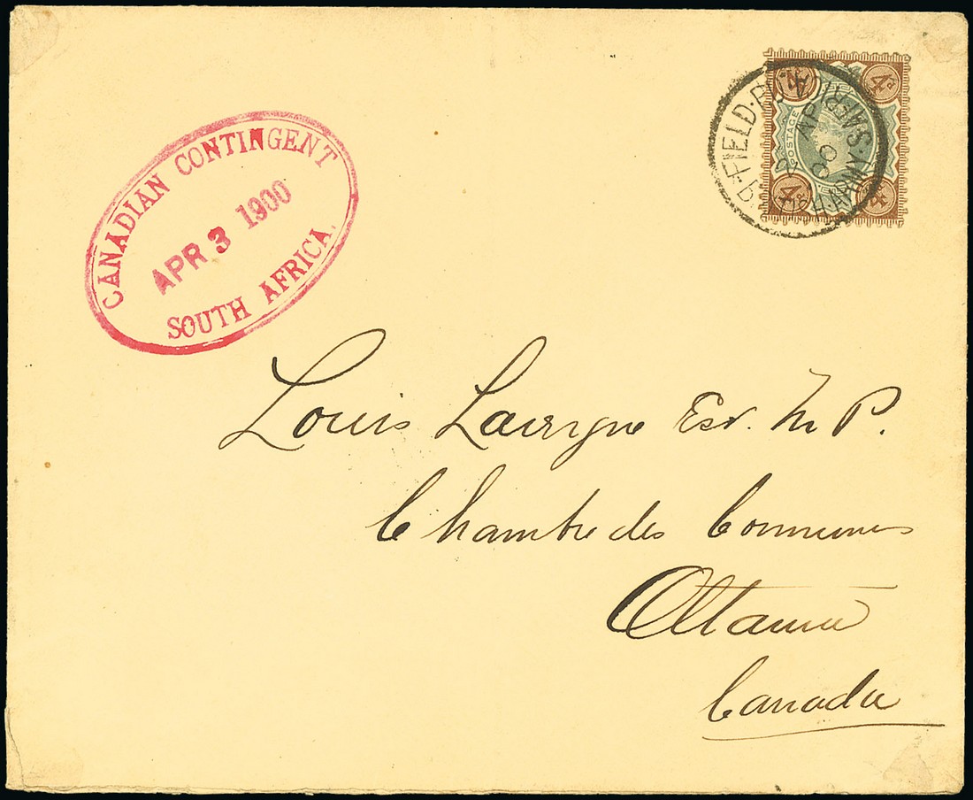 1900 (2 Apr.) envelope to Ottawa, bearing G.B. 4d. green and brown neatly cancelled by F.P.O. single-ring c.d.s. and showing a fine strike of the oval-framed "canadian contingent/south africa" datestamp in red at left, the reverse with Ottawa and House of Commons (in blue) c.d.s. for 7 May. Scarce and most attractive. Photo
