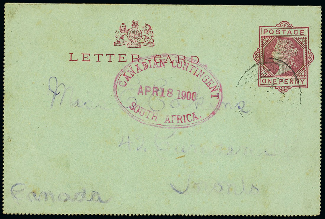 1900 (12 Apr.) G.B. 1d. letter card from G.R. Eakins of "C" Company at Bloemfontein to Toronto, cancelled by light F.P.O. c.d.s. and with fine oval-framed "canadian contingent/south africa" datestamp (18.4) in red; contents include "they say that the ship with our last mail went down", a reference to the sinking of the S.S. Mexican. Photo