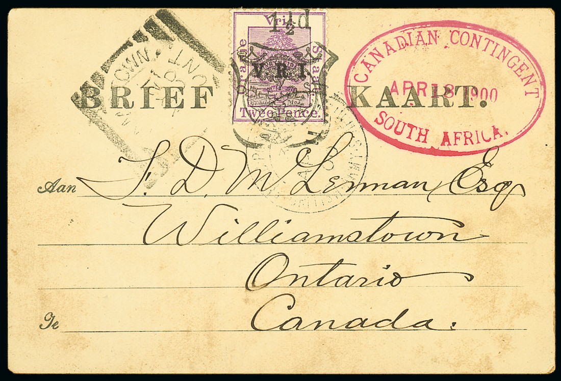 1900 (18 Apr.) O.F.S. 1½d. on 2d. card from J.A. McLennan of "C" Company at Bloemfontein to Williamstown, Ontario, showing light F.P.O. c.d.s. fine oval-framed "canadian contingent/south africa" datestamp in red and arrival squared-circle datestamp (21.5), contents include "There is about 6000 troops around here and we expect to move north in a few days. A good many of our regiment are sick but not dangerous...". Photo