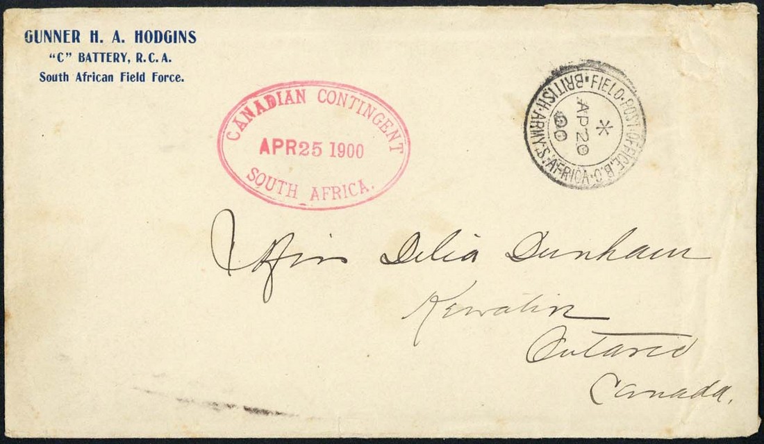 1900 (20 Apr.) unfranked Hodgins corner envelope from C.H. Dunham of "C" Company at Bloemfontein to Ontario, showing F.P.O. c.d.s. and a fine strike of the oval-framed "canadian contingent/south africa" datestamp (25.4) in red, Keewatin arrival c.d.s. (25.5) on reverse