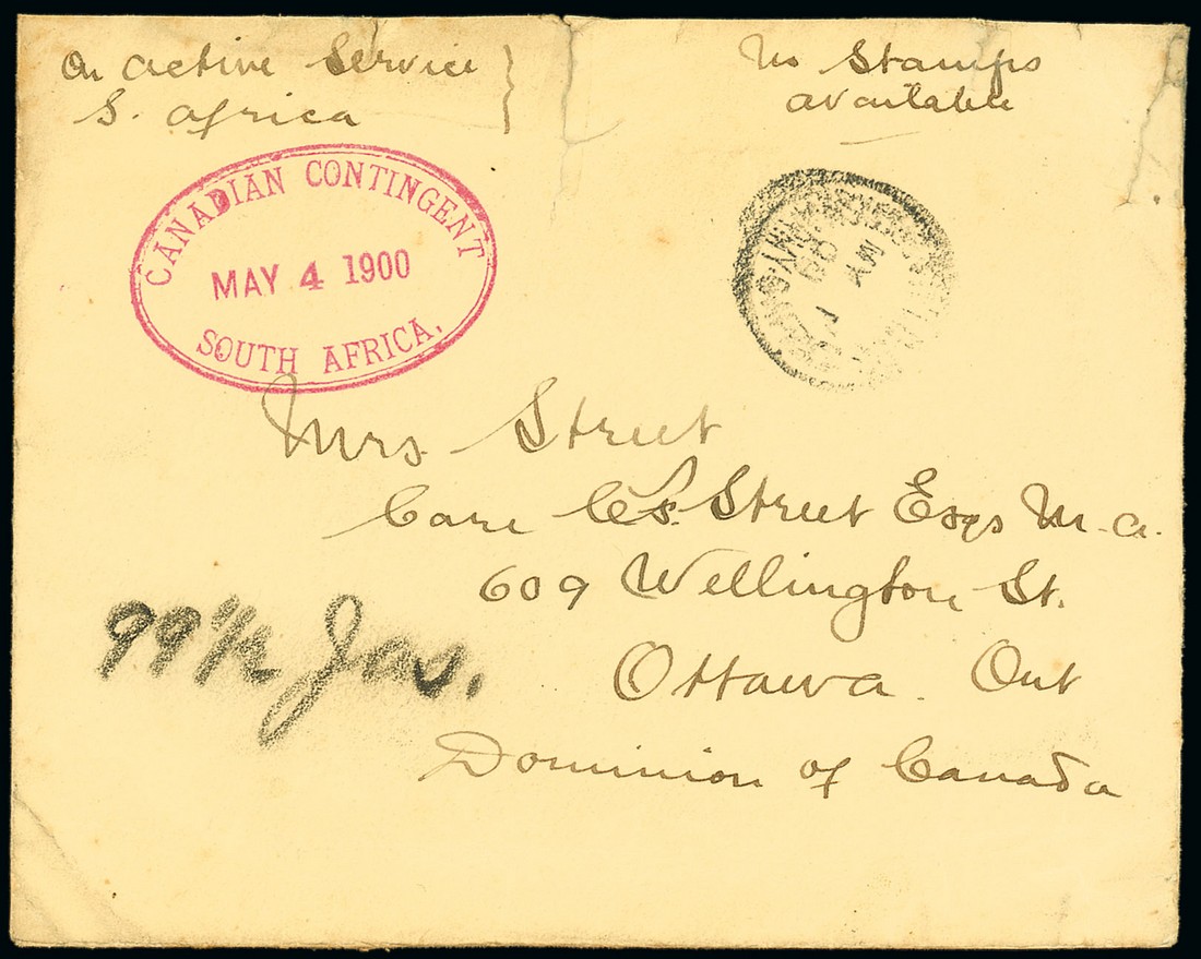 1900 (1 May) unstamped envelope (two small tears at top) from L.J. Street of "D" Company at Thaba N'Chu to Ottawa, marked "On Active Service S. Africa. No Stamps available" and showing part Army P.O. c.d.s. and fine oval-framed "canadian contingent/south africa" datestamp (4.5) in red, light arrival c.d.s. (4.6) on reverse. Photo