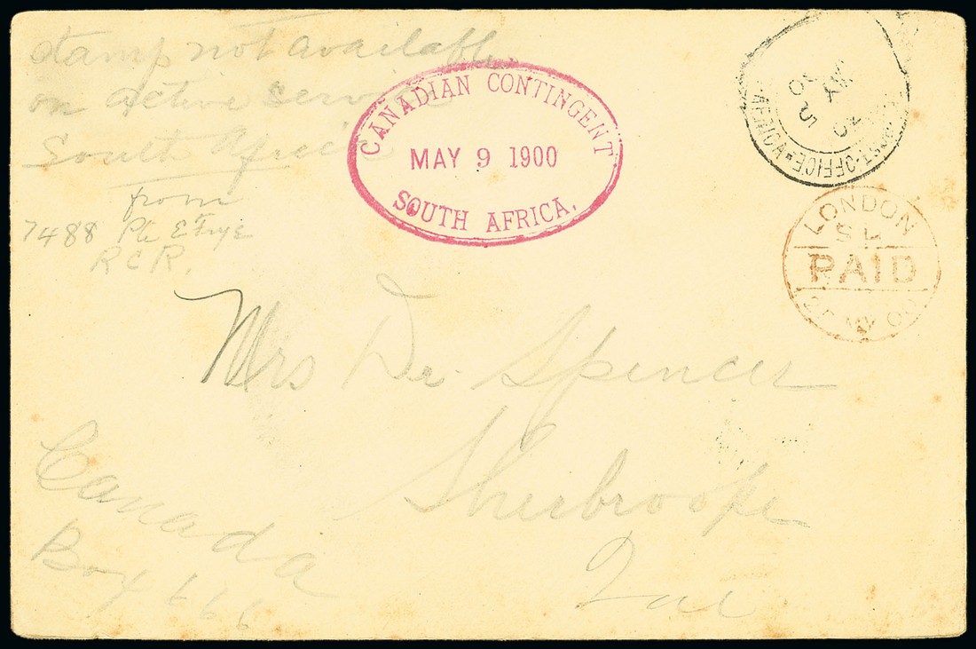 1900 (5 May) unstamped envelope "from Pte C.E. Frye" of "D" Company at Winburg to Sherbrooke, showing light F.P.O. 30 c.d.s. (Taaiboschkraal) alongside London Paid c.d.s. (25.5) and with a fine strike of the oval-framed "canadian contingent/south africa" datestamp (9.5) in red, arrival c.d.s. (4.6) on reverse. Photo