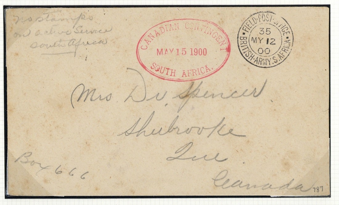 1900 (15 May) unstamped envelope from C.E. Frye of "D" Company at Kroonspruit to Sherbrooke, showing fine F.P.O. 35 c.d.s. alongside equally fine oval-framed "canadian contingent/south africa" datestamp (15.5) in red, arrival c.d.s. (11.6) on reverse