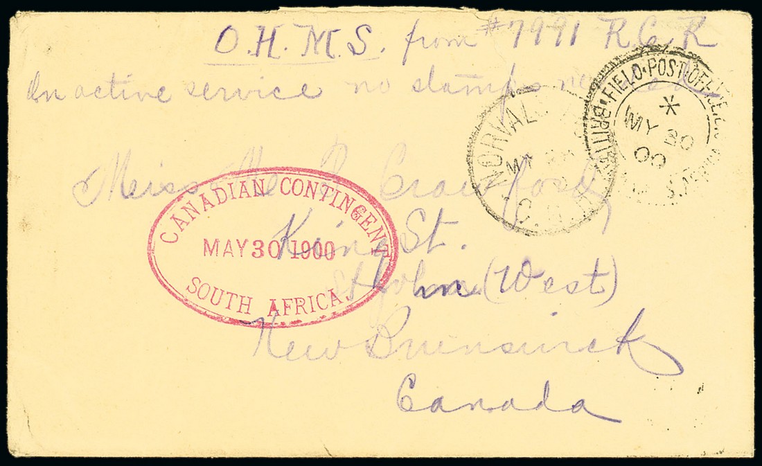 1900 (28 May) unstamped envelope "O.H.M.S. from "#7991 RCR On Active Service no stamps needed" to New Brunswick, showing Norval's Point c.d.s., F.P.O. c.d.s. (30.5) and with fine oval-framed "canadian contingent/south africa" datestamp (30.5) in red. St. John c.d.s. (25.6) on reverse. Photo