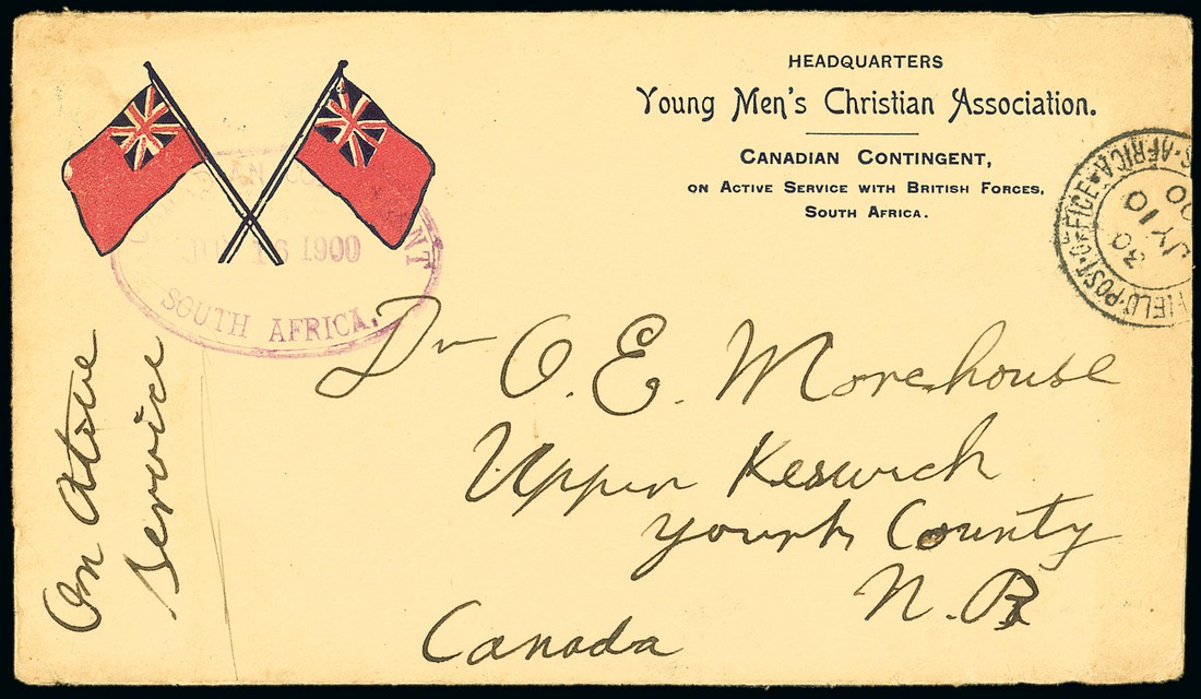 1900 (10 July) Y.M.C.A. "crossed flags" envelope (Type E), complete with letter, from J.H. Wilson at Springs, Transvaal to New Brunswick, showing large part F.P.O. 30 c.d.s. and generally fine oval-framed "canadian contingent/south africa" datestamp (16.7) in lilac struck across flags; the letter including reference to DE Wet "getting some of our mail" and "our regiment is not very strong only 200 fit for duty" and an account of the battle of Doornkop. Photo