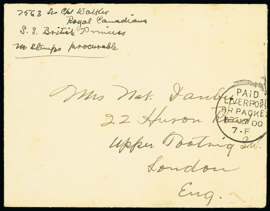 1900 (15 July) unstamped envelope from Cpl. L.C. Walker of "C" Company on board the S.S. British Princess at Liverpool to London, marked "No stamps procurable" and with Liverpool Br. Packet c.d.s.; Cpl. Walker was among some 380 who were invalided home. Photo
