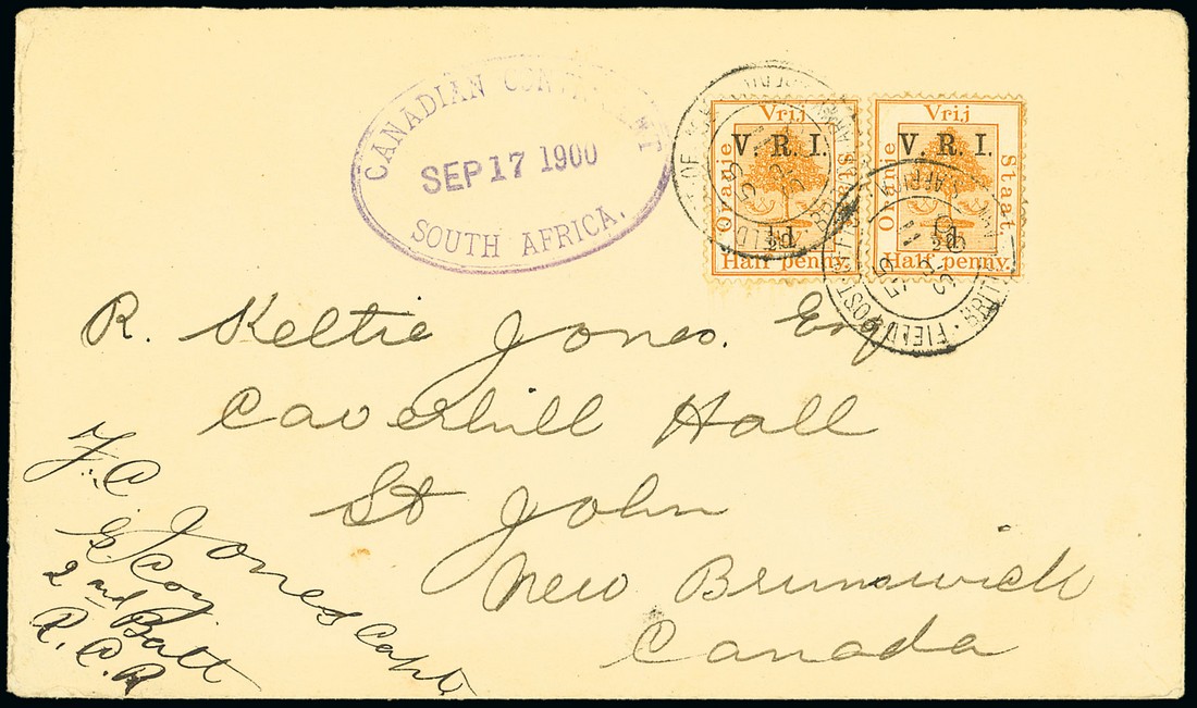 1900 (11 Sept.) envelope from Capt. J.C. Jones of "G" Company at C\ape Town to St. John, New Brunswick, bearing O.F.S. V.R.I. both cancelled by F.P.O. 55 c.d.s. with oval-framed "canadian contingent/south africa" datestamp (17.9) in violet, arrival c.d.s. (17.10) on reverse. Photo