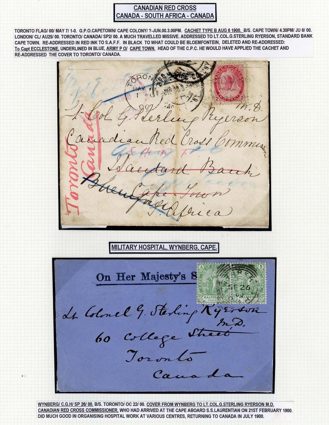 1900 (May) envelope from Toronto to Lt. Col. Ryerson of the Canadian Red Cross Commission in Cape Town, franked at 2c. and with a faint strike of the Contingent cachet in violet, redirected three times and eventually sent back to Toronto, and 1900 (26 Sept.) OHMS blue envelope from Military Hospital, Wynberg to the same addressee in Canada, franked at 1d. with squared-circle datestamp; an unusual pair to Ryerson who had arrived on board S.S. Laurentian and who did much good in organising hospital work at various centres