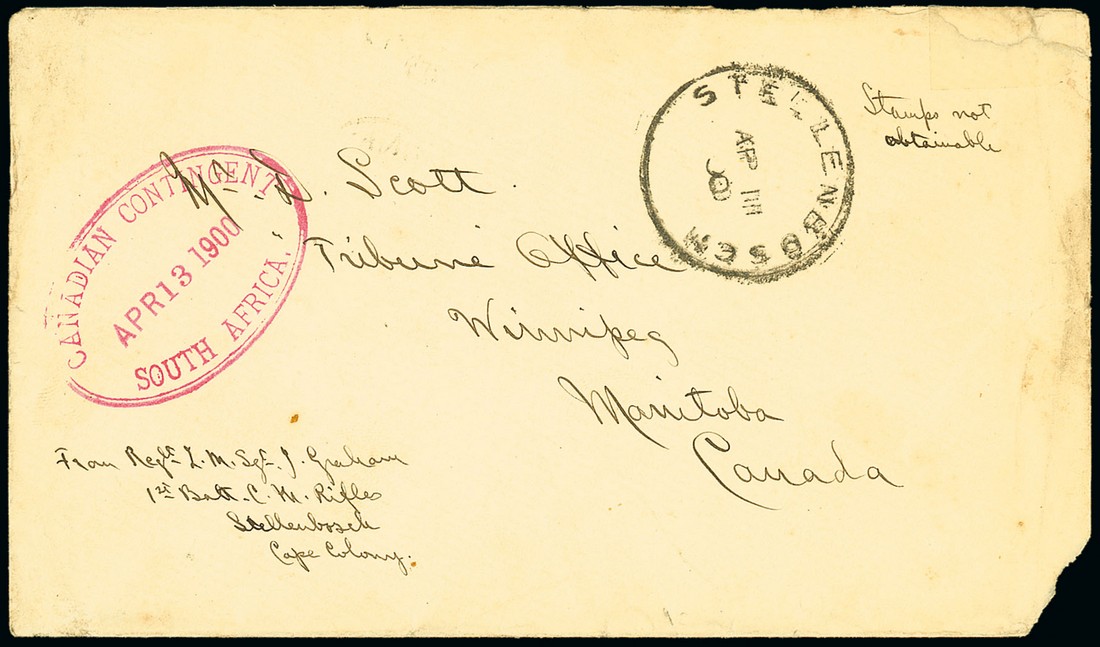 1900 (11 Apr.) unstamped envelope from Regt. Q.M. Sgt. J. Graham at Stellenbosch to Winnipeg, marked "Stamps not obtainable" alongside Stellenbosch c.d.s. and with a fine strike of the oval-framed "canadian contingent/south africa" datestamp (13.4) in red, arrival c.d.s. (23.3) on reverse. Photo