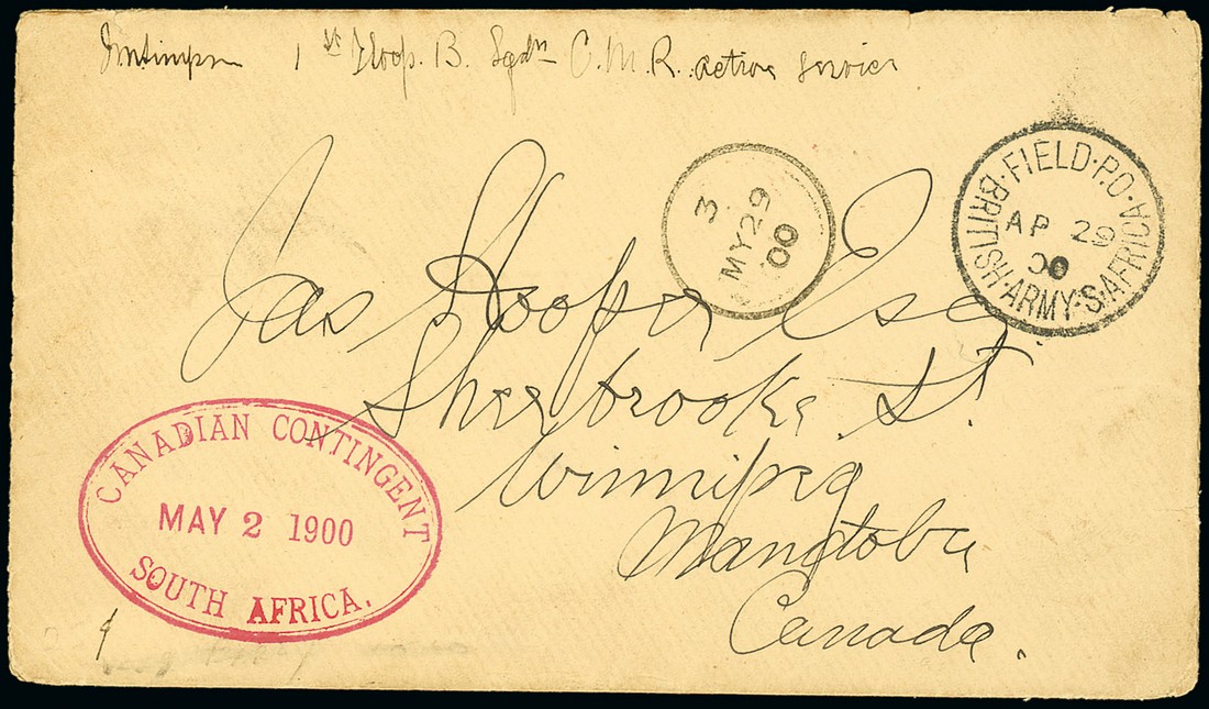 1900 (29 Apr.) Auxiliary of Y.M.C.A. unstamped envelope (imprint on flap) from J.M. Simpson of "B" Squadron at Bloemfontein to Manitoba, showing F.P.O. c.d.s., oval-framed "canadian contingent/south africa" datestamp (2.5) in red and arrival c.d.s. (29.5), all on face, Winnipeg c.d.s. (29.5) on reverse; most attractive. Photo