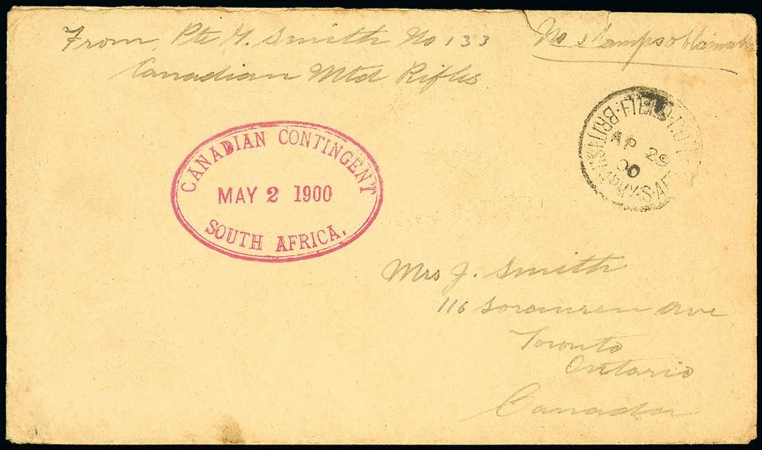 1900 (29 Apr.) unstamped envelope "From Pte. G. Smith No. 133 Canadian Mounted Rifles No stamps obtainable" at Fischer's Farm, Bloemfontein to Toronto, showing F.P.O. c.d.s. and superb oval-framed "canadian contingent/south africa" datestamp (2.5) alongside, arrival c.d.s. (date unclear) on reverse. Photo