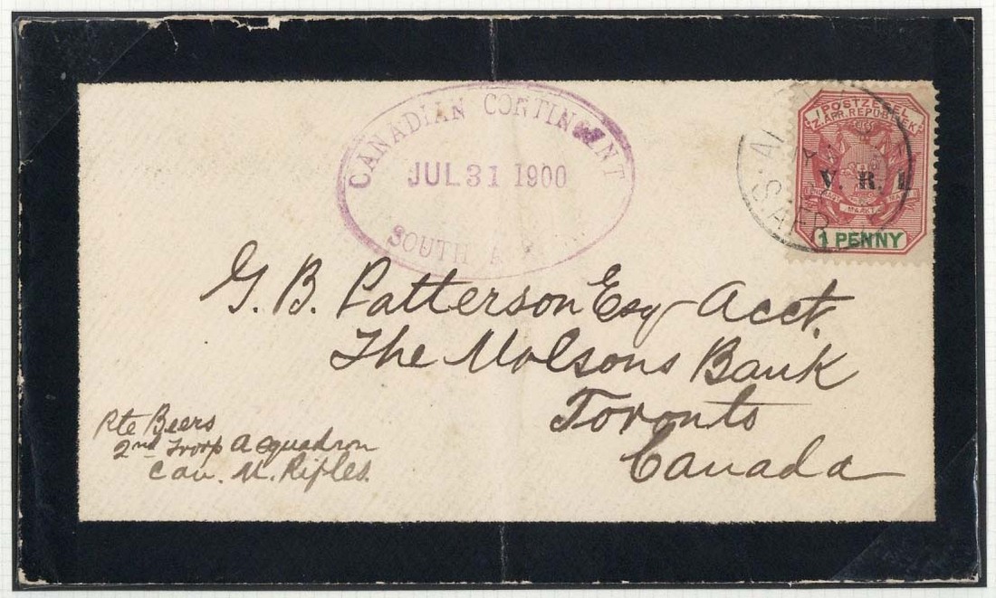 1900 (25 July) mourning envelope from Private L.M. Beers at Middelburg, Transvaal to Toronto, bearing V.R.I. 1d. cancelled by Army P.O. 55 c.d.s. and with a good strike of the oval-framed "canadian contingent/south africa" datestamp (31.7) alongside, indistinct arrival c.d.s. on reverse
