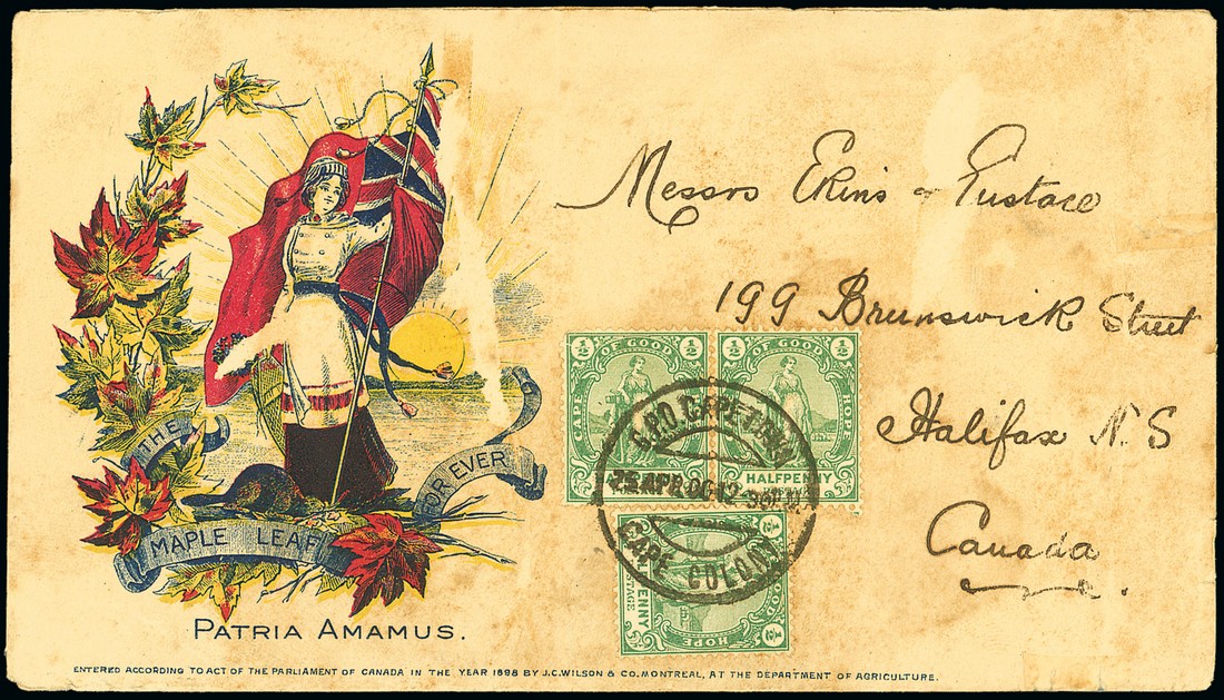 1900 (25 Apr.) "the maple leaf forever" J.C. Wilson patriotic envelope (Type 50-10) from Lt. R.W.B. Eustace at Cape Town to Halifax. Nova Scotia, bearing ½d. (3) sharing c.d.s. and showing arrival c.d.s. (23.5) on reverse; some soiling on face though not unattractive. Photo