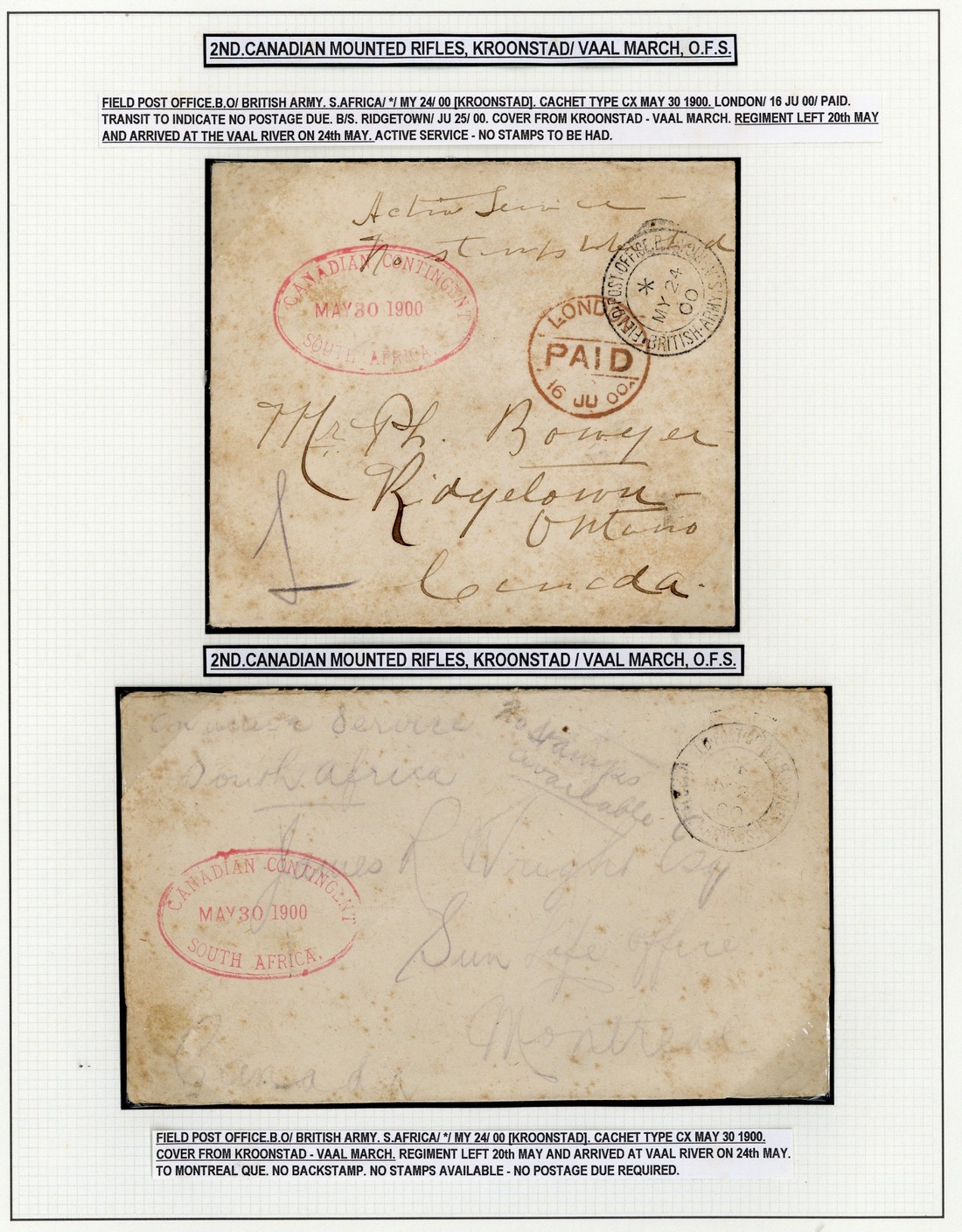 1900 (24 May) pair of unstamped envelopes (stains in places) from Kroonstadt, Transvaal, both with F.P.O. c.d.s. and oval-framed "canadian contingent/south africa" datestamp (30.5) in red with one also showing London Paid c.d.s.