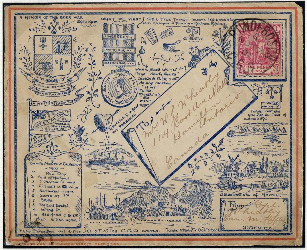 1900 (7 Nov.) Budrick's patriotic envelope (soiled) from Cpl. W.J. Wheatley of "A" Squadron at Rondebosch Hospital to Hamilton, Ontario, bearing 1d. with c.d.s. and with arrival c.d.s. (8.12) on reverse