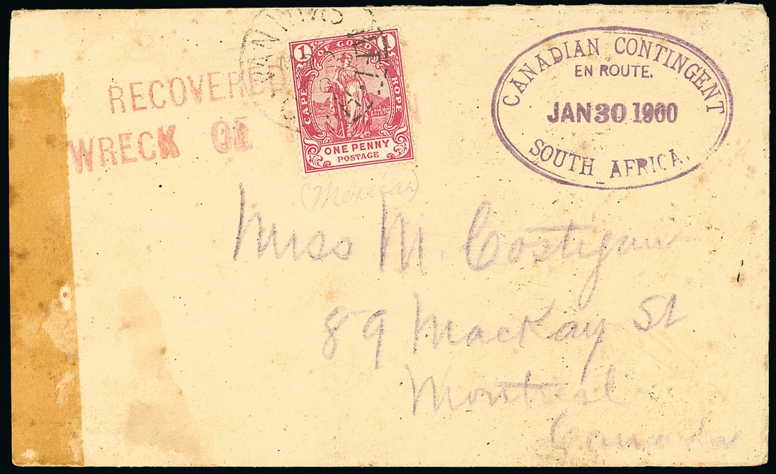 1900 (26 Mar.) Allen Line crested envelope from Capt. R. Costigan of "E" Battery at Van Wyks Vlei to Montreal, bearing Cape 1d. with c.d.s. and additionally tied by "recovered from/wreck of mexican" cachet in red, and showing a superb strike of the oval-framed "canadian contingent/en route/south africa" datestamp (30.1) alongside, arrival c.d.s. (7.5) on reverse; sellotape stain at left though a very rare "held over" example of the En Route cachet and the only example recorded in combination with the Mexican wreck cachet. Photo