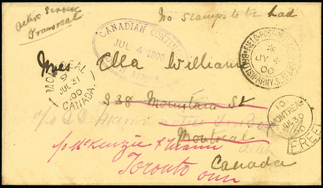 1900 (4 July) unstamped envelope from S.R. Williams of "C" Battery at Rustenburg, Transvaal to Montreal and redirected to Toronto, marked "no stamps to be had" and showing F.P.O. c.d.s., oval-framed "canadian contingent/south africa" datestamp in lilac, Montreal and Montreal Free datestamps (31.7), all on face. Photo