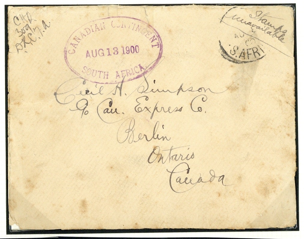 1900 (13 Aug.) unstamped envelope from C.H. Quirenbach of "D" Battery at Pienaar'spoort to Berlin, Ontario, marked "Stamps unavailable" and showing part Army P.O. c.d.s. and oval-framed "canadian contingent/south africa" datestamp in lilac