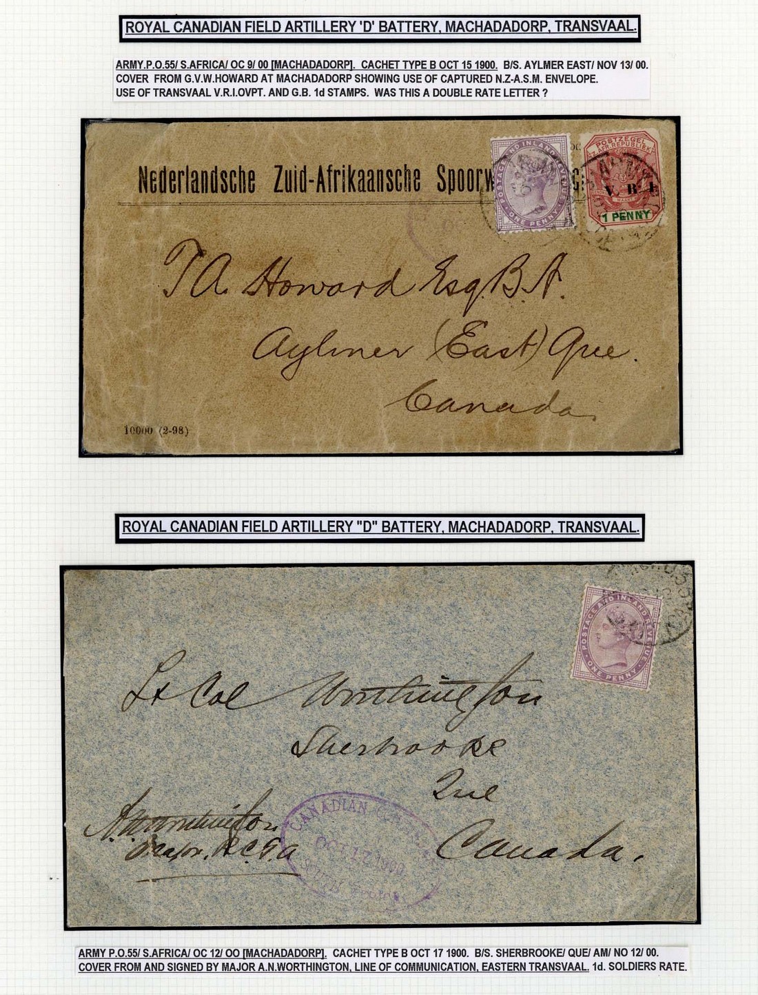 1900 (Oct.) pair of envelopes from members of "D" Battery at Machadadorp, Transvaal, one (captured N.Z.-A.S.M. envelope) from G.V.W. Howard to Aylmer East bearing Transvaal 1d. and G.B. 1d. with Army P.O. c.d.s. and trace of the Contingent cachet, the other signed by Major A.N. Worthington to Lt. Col. Worthington at Sherbrooke, Quebec bearing G.B. 1d. with part Army P.O. c.d.s. and showing a good strike of the oval-framed "canadian contingent/south africa" datestamp