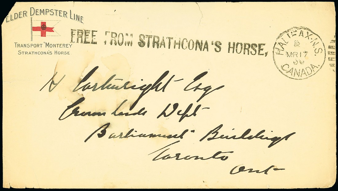 1900 (17 Mar.) Elder Dempster "transport monterey strathcona's horse" illustrated corner envelope (opened-out, a couple of faults) from Halifax to Parliament Buildings, Toronto, showing a good strike of he very rare "free from strathcona's horse," handstamp, believed to be unofficial, with despatch datestamp alongside, arrival c.d.s. (20.3) on reverse. Photo