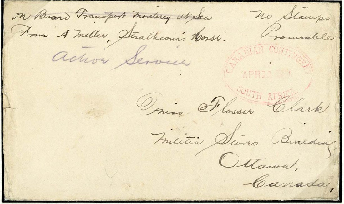 1900 (11 Apr.) unstamped envelope from A Miller "On Board Transport Monterey as Sea No Stamps Procurable" to Ottawa, however posted on arrival with "On Board" notation crossed through and replaced by "Active Service" and with a light strike of the oval-framed "canadian contingent/south africa" datestamp, Ottawa c.d.s. (7.5) on reverse