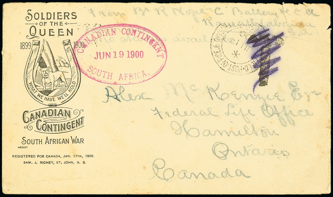 1900 (14 June) Richey unstamped "soldiers of the queen" patriotic envelope from Bombadier R.S. Hope of "C" Battery at Ramatlabane via the Northern Route via Bulawayo to Hamilton, Ontario, showing F.P.O. c.d.s. deleted "T" handstamp and a good strike of the oval-framed "canadian contingent/south africa" datestamp (19.6) in red, the reverse with Bulawayo (28.5) and Hamilton (17.7) c.d.s.. Photo