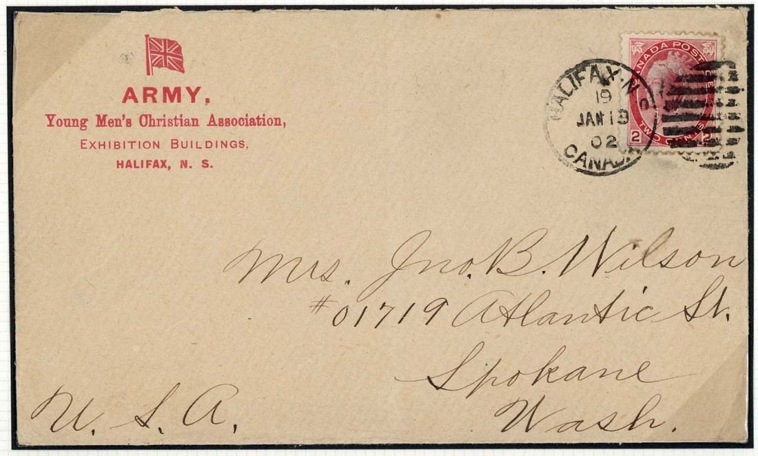 1902 (13 Jan.) Y.M.C.A. Army envelope (red imprint) from Halifax to Spokane, Washington, bearing 2c. with duplex and showing arrival c.d.s. (25.1) on reverse; the unit sailed on 28 January aboard S.S. Victorian