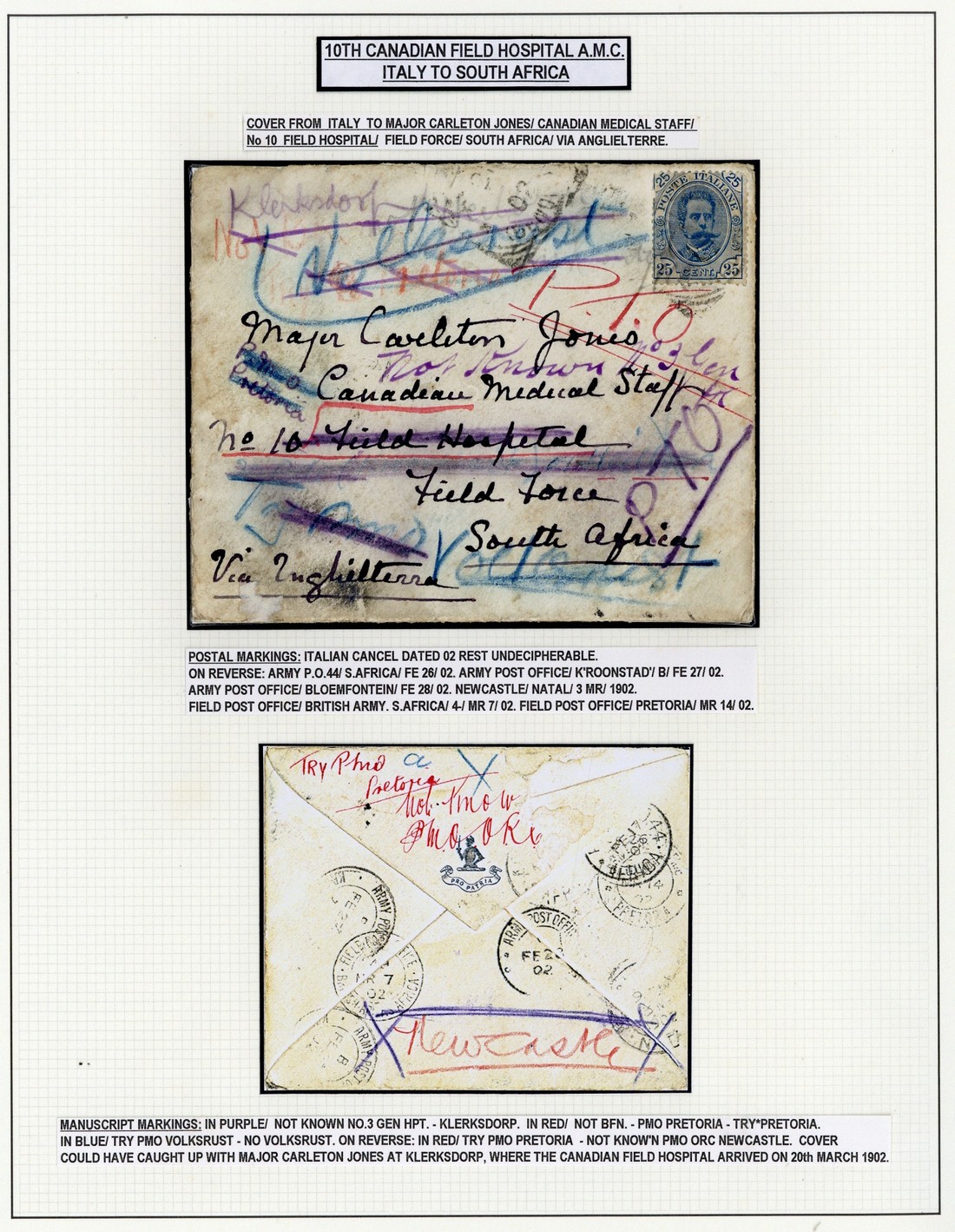 1902 (Feb.) envelope to Major Carleton Jones "Canadian Medical Staff No. 10 Field Hospital Field Force South Africa", much redirected and with Army and Field Post Office c.d.s. on reverse, possibly catching up with him at Klerksdorp where the field hospital arrived on 20 March; some soiling though full of character