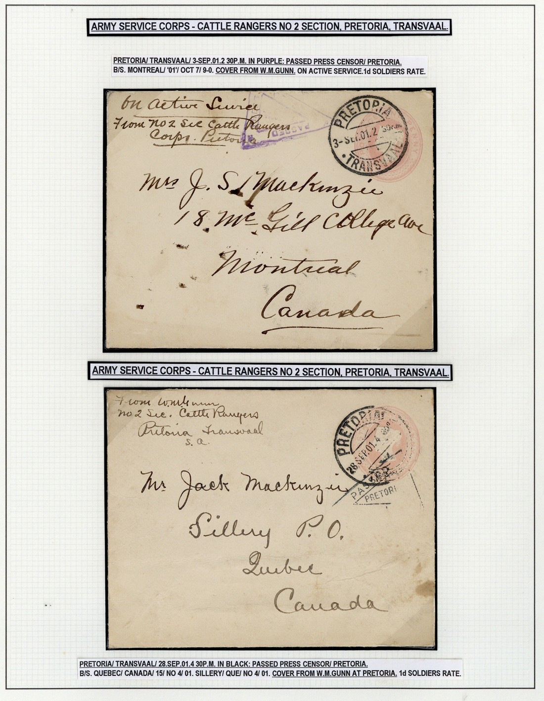 1901 (Sept.) pair of G.B. 1d. pink envelopes ex the same correspondence from W.W. Gunn, No. 2 Section Cattle Rangers, Pretoria to Montreal and Quebec, both cancelled by Pretoria c.d.s. and showing triangular-framed censor cachets, arrival c.d.s. on reverse