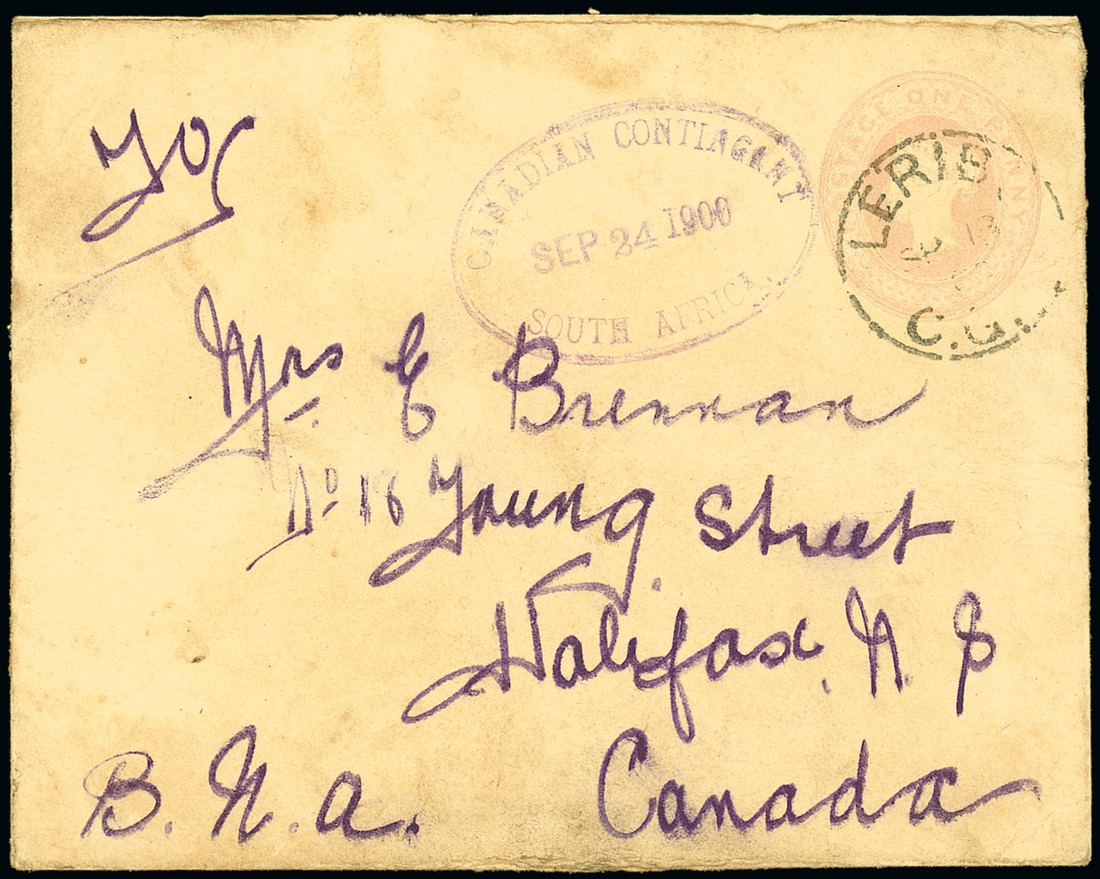 1900 (13 Sept.) G.B. 1d. pink envelope from Leribe, Basutoland to Halifax, cancelled by single-ring datestamp and showing oval-framed "canadian contingent/south africa" oval datestamp (24.9) in violet alongside; overall soiling though an exceptional cover with only one other recorded. Photo