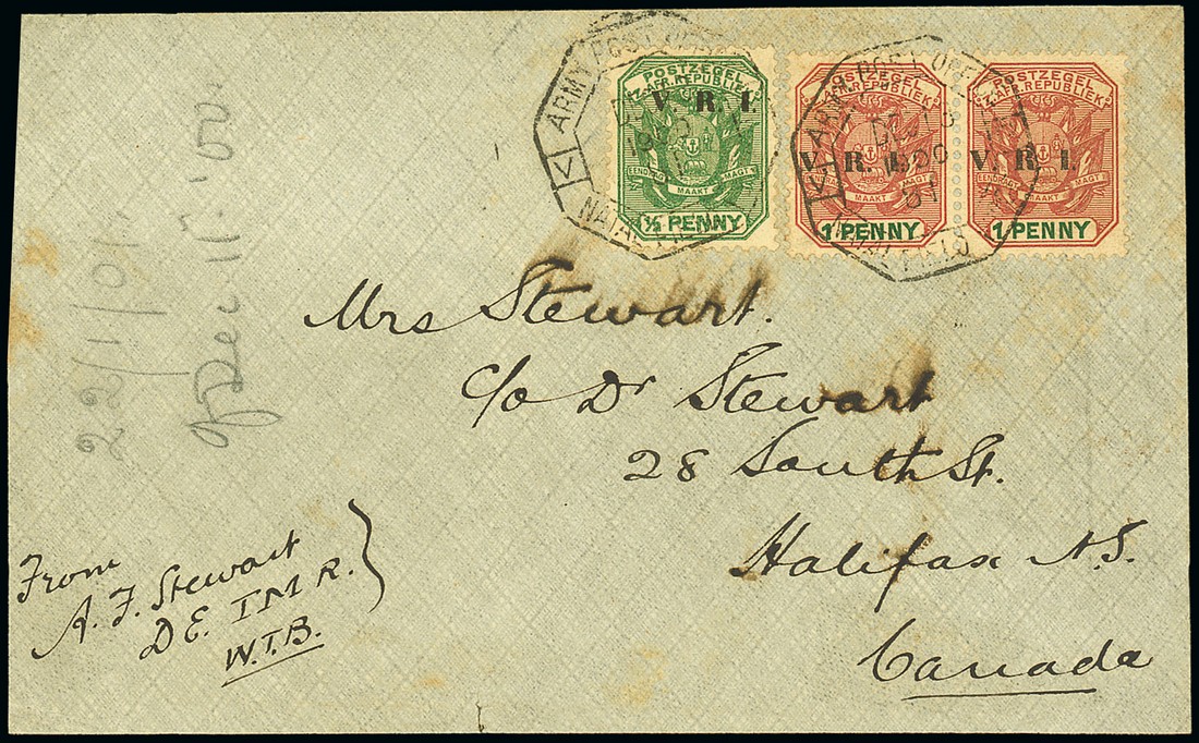 1900 (13 Dec.) envelope from A.F. Stewart, District Engineer, Imperial Military Railways, Waterval Boven, Transvaal, bearing V.R.I. ½d. and 1d. (2) twice cancelled by Natal Field Force octagonal datestamp, believed at this time to have been at Machadadorp, arrival c.d.s. (21.1) on reverse. Photo