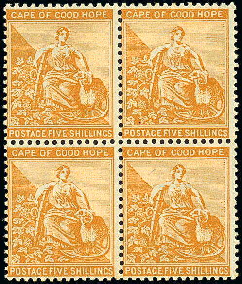 1893-98 ½d. to 5/- set of eight with additional 1/- yellow-ochre shade, each in a block of four, the 3d. with gum wrinkles otherwise fresh and fine unmounted mint. An extremely rare set. S.G. 61-68. SACC Cat. R48,500 for U.M. Photo