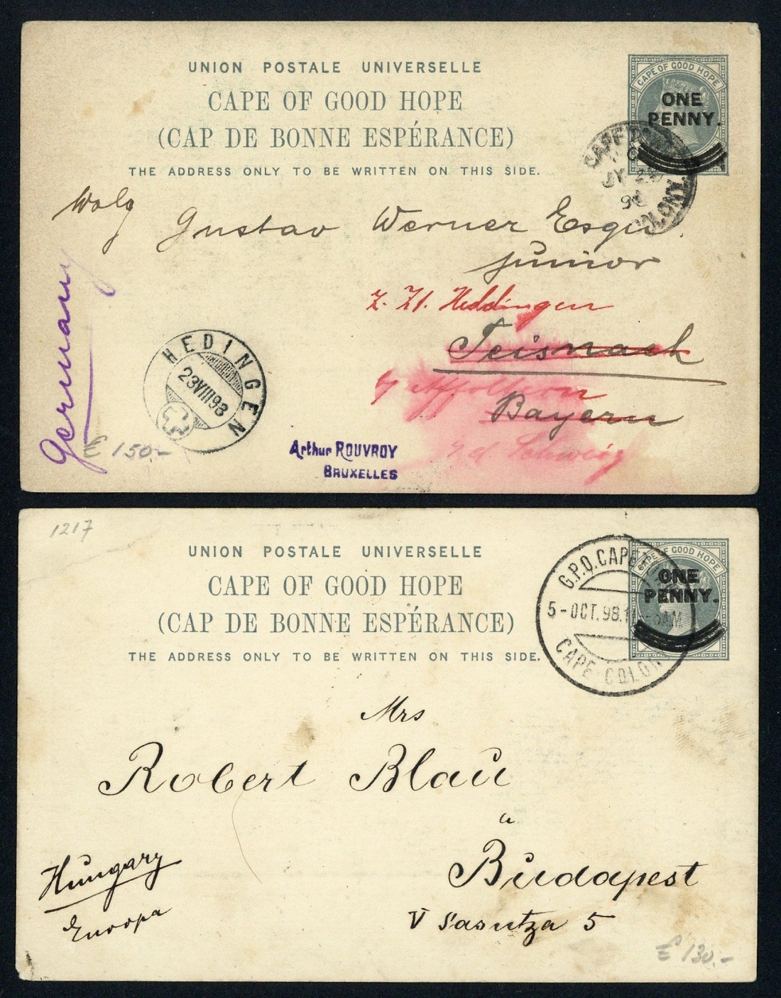 1897 1d. on 1½d. grey with U.P.U. heading and three lines under surcharge and with privately printed coloured views of Cape Town on reverse (2), one used from Cape Town (July 1898) to Germany and redirected (ink smudging) locally with view of The Docks in green, the other from Cape Town (Oct 1898) to Hungary with view of Adderley Street in grey-blue. Rare.