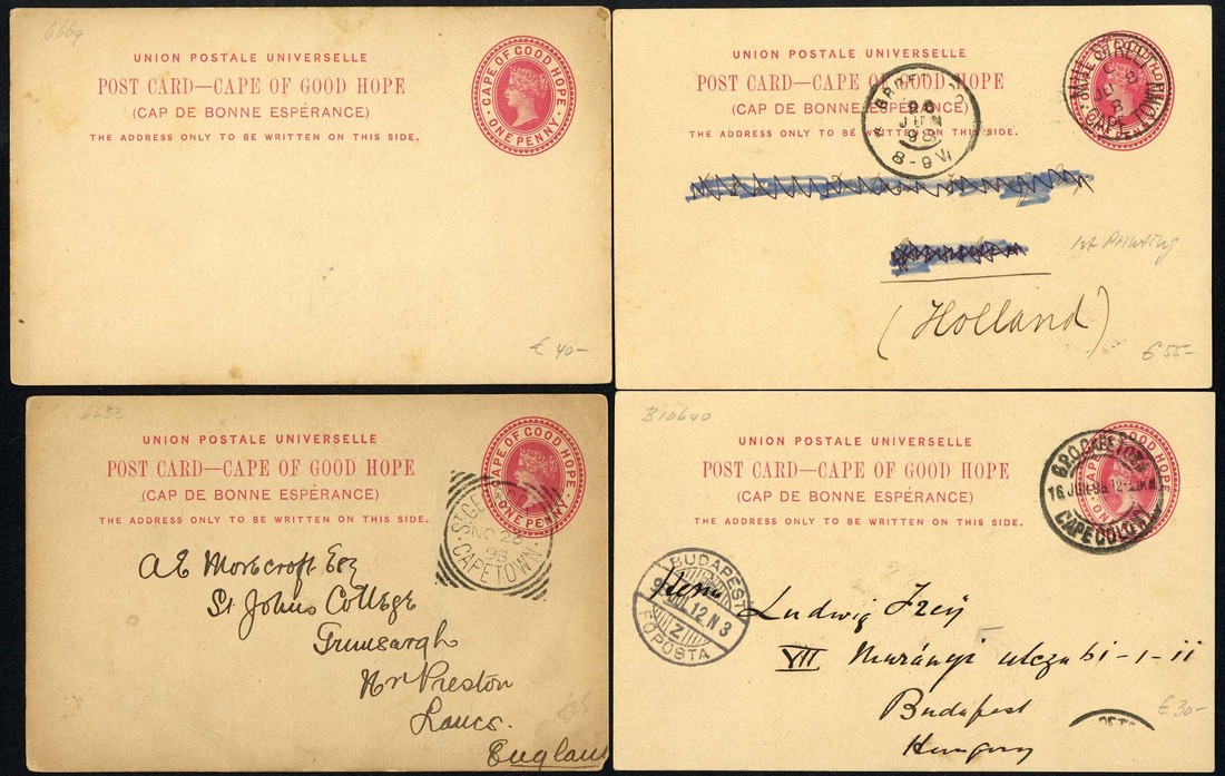1898 1d. carmine card with views of Cape Town printed in sepia on reverse (4), comprising Table Mountain used to England, View of Claremont (2, one unused and one used to Hungary) and Queen's Hotel, Sea Point used to Holland with address crossed through; a couple with small faults though a scarce group