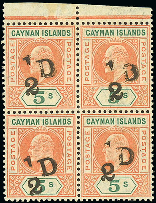 "½d" on 5/- salmon and green, a block of four with part sheet margin at top, the upper pair with light horizontal crease along top which in no way affects superb appearance, the lower pair unmounted. A rare multiple. Brandon Certificate (1983). S.G. 18, £1200. Photo