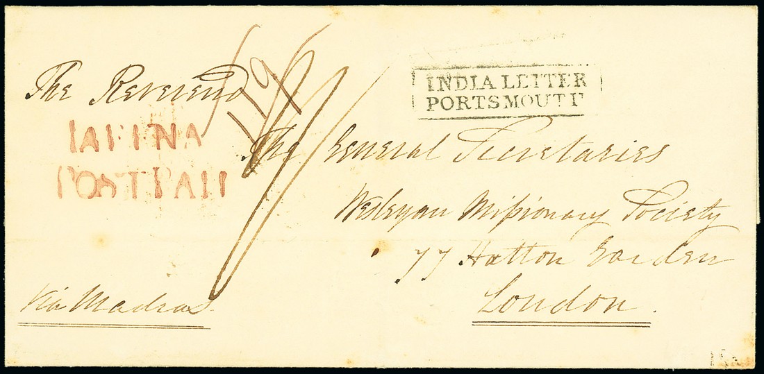 1838 (July) missionary entire to London, rated "1/1", showing fine "jaffna/post paid" in red, framed "india letter/portsmouth" and, on reverse, Madras Ship Letter transit d.s. (19.2) and red arrival (13.6). Photo